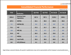 The company said that the sugar sales are at 0.69 lakh tons in the 9 months of 2025 vs. 0.58 lakh tons in the corresponding period in 2024. The sugar realisation is up at Rs. 40259/ton vs. Rs 38048/ton.