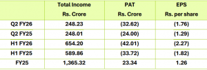 In Q2 FY26, the company reported a Loss After Tax (LAT) of ₹ 32.62 crore, compared to a LAT of ₹ 24.00 crore in Q2 FY25. For H1 FY26, the company reported a LAT of ₹ 42.01 crore, as against ₹ 33.72 crore in the corresponding period of the previous financial year.