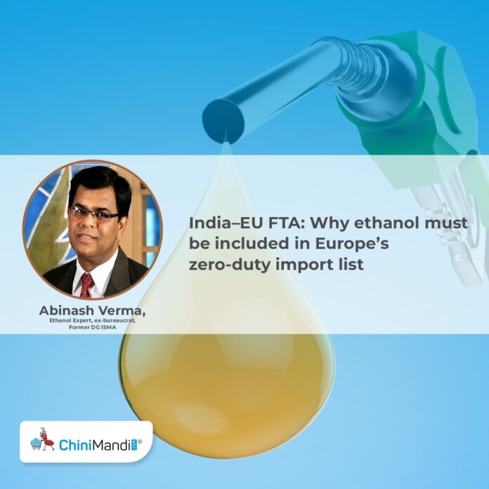 Abinash Verma, Ethanol Expert, ex-bureaucrat, Former DG ISMA and Promoter Shareholder of Grain-based ethanol plant, told ChiniMandi that ethanol should be included in the EU’s zero-duty import list. This would help absorb excess ethanol production and create a steady market for producers.