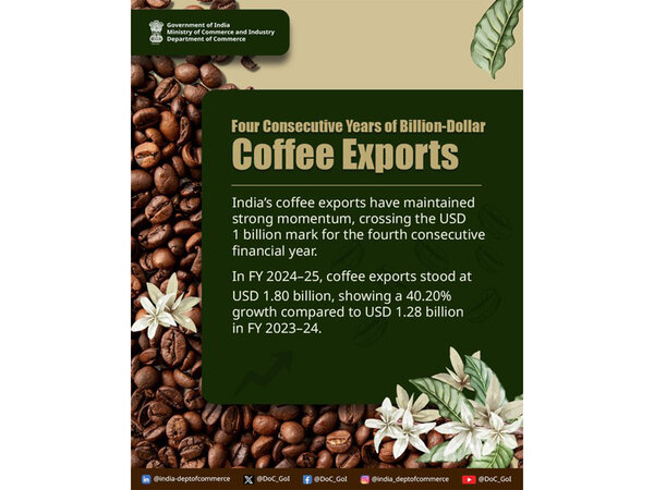 New Delhi [India]: India’s coffee exports have continued their strong upward trajectory, maintaining their billion-dollar streak for the fourth consecutive financial year, according to the Department of Commerce under the Ministry of Commerce and Industry.