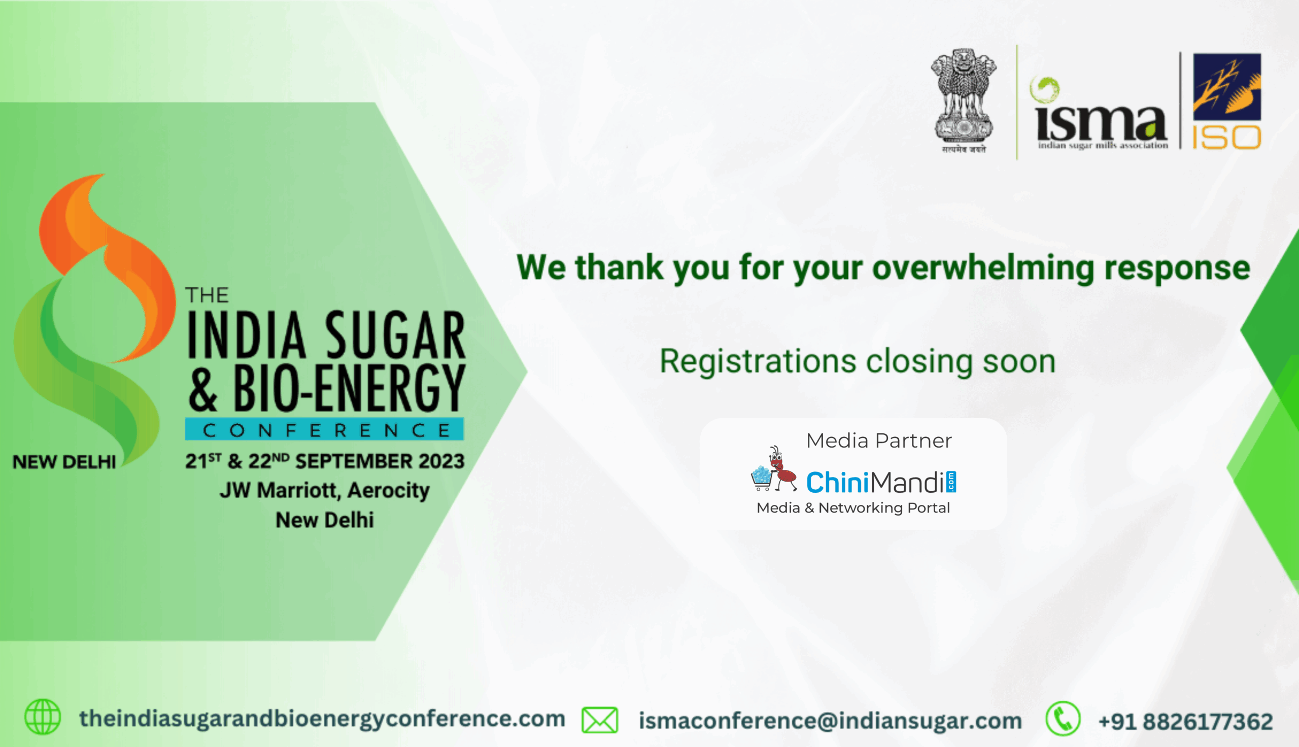 The 1st Edition of ‘The India Sugar & Bio-Energy Conference, 2023’, a collaborative effort between the Government of India, Indian Sugar Mills Association (ISMA), and International Sugar Organisation (ISO) is receiving an enthusiastic response from the participants, setting a positive tone for the event. The registrations will be closing soon for the event.