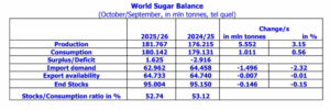 The internsational sugar body said, “The outlook for prices over the next three months is neutral as the 2024/25 trade deficit was resolved in part through stock releases in India, while the projected surplus in the 2025/26 cycle is still too modest to be significant, as harvest results only slowly become available and crop failures often only become apparent partway or at the end of harvests. Meanwhile, export programmes, for 2025/26, might not be fully operational subject to prevailing price levels and domestic market parities.”