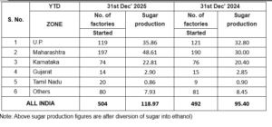 Karnataka has also reported accelerated crushing activity, with sugar production rising by around 12% compared to the same period last year.