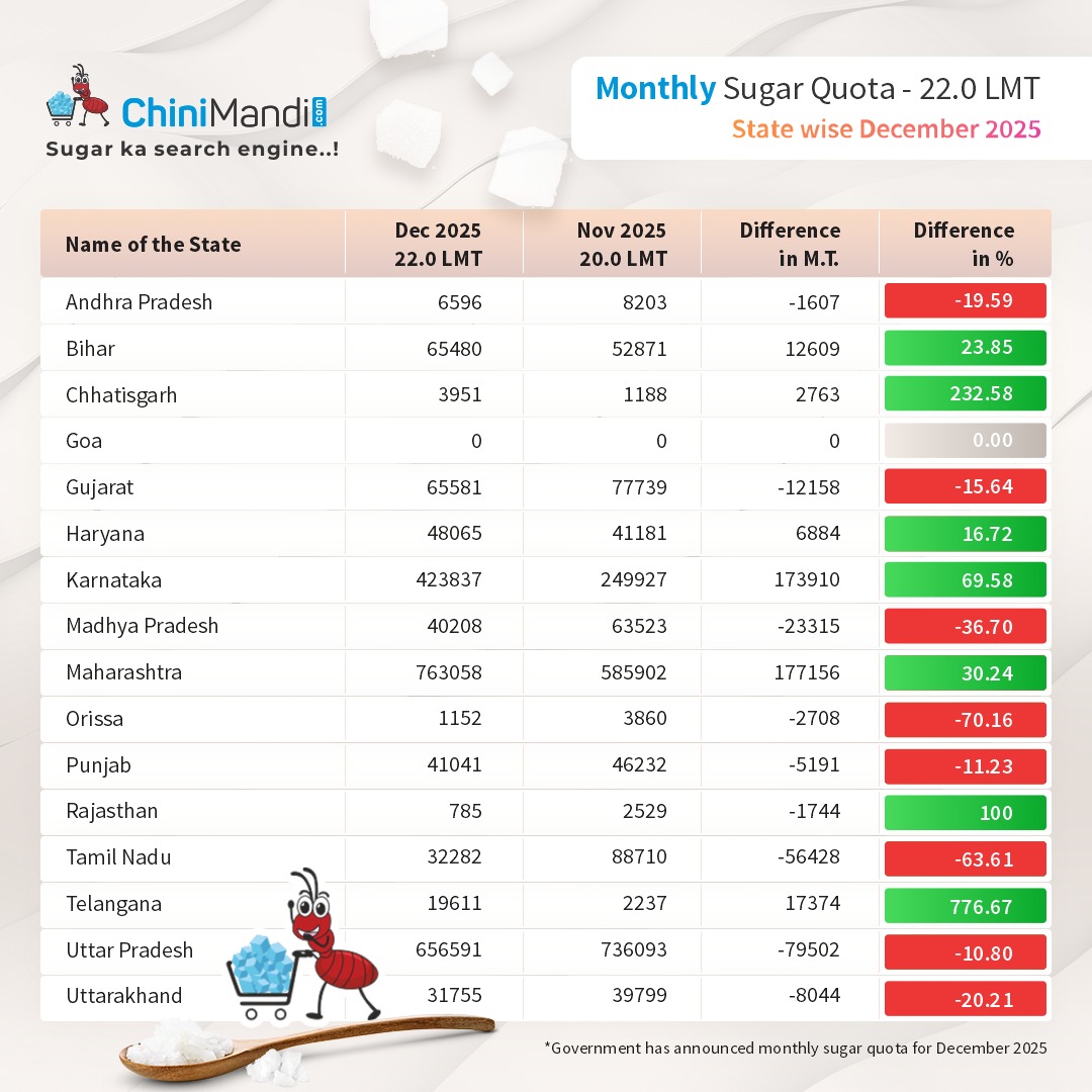 In a notification issued on November 28, the Food Ministry allocated a monthly sugar quota of 22 lakh metric tonnes (LMT) for December 2025 to 581 mills, which is equal to the quota allocated for December 2024.