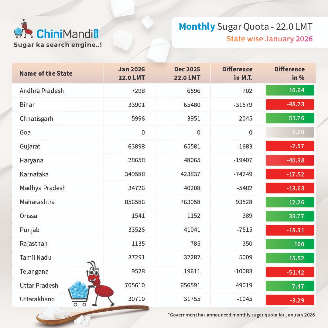 In a notification released on December 31, the Food Ministry allocated a monthly sugar quota of 22 lakh metric tonnes (LMT) for January 2026 to 581 sugar mills, which is lower than the quota allocated for January 2025.