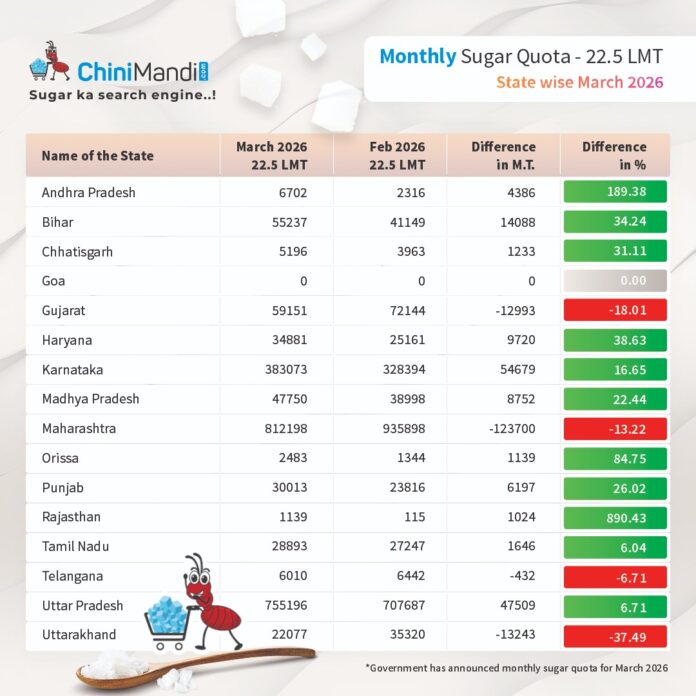 In a notification released on February 27, the Food Ministry allocated a monthly sugar quota of 22.5 lakh metric tonnes (LMT) for March 2026.