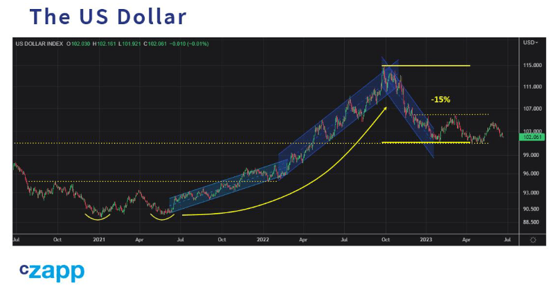 Compare this to the US Dollar’s recent parabola. The US Dollar is the most liquid asset on the planet. If formed a parabolic advance over 15 months in 2021 and 2022, but when this broke it fell 15%.
